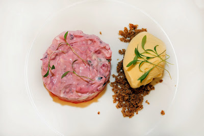 Lombinho de salmão com estufado de favas, caldo
