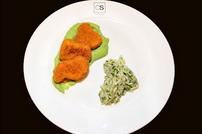 Nuggets com puré de ervilha e Arroz cremoso de