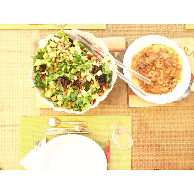 Os almoços são sempre saladas ( grandes e recheadas) e hoje acompanhamos com uma tortilha - a minha primeira tortilha.