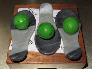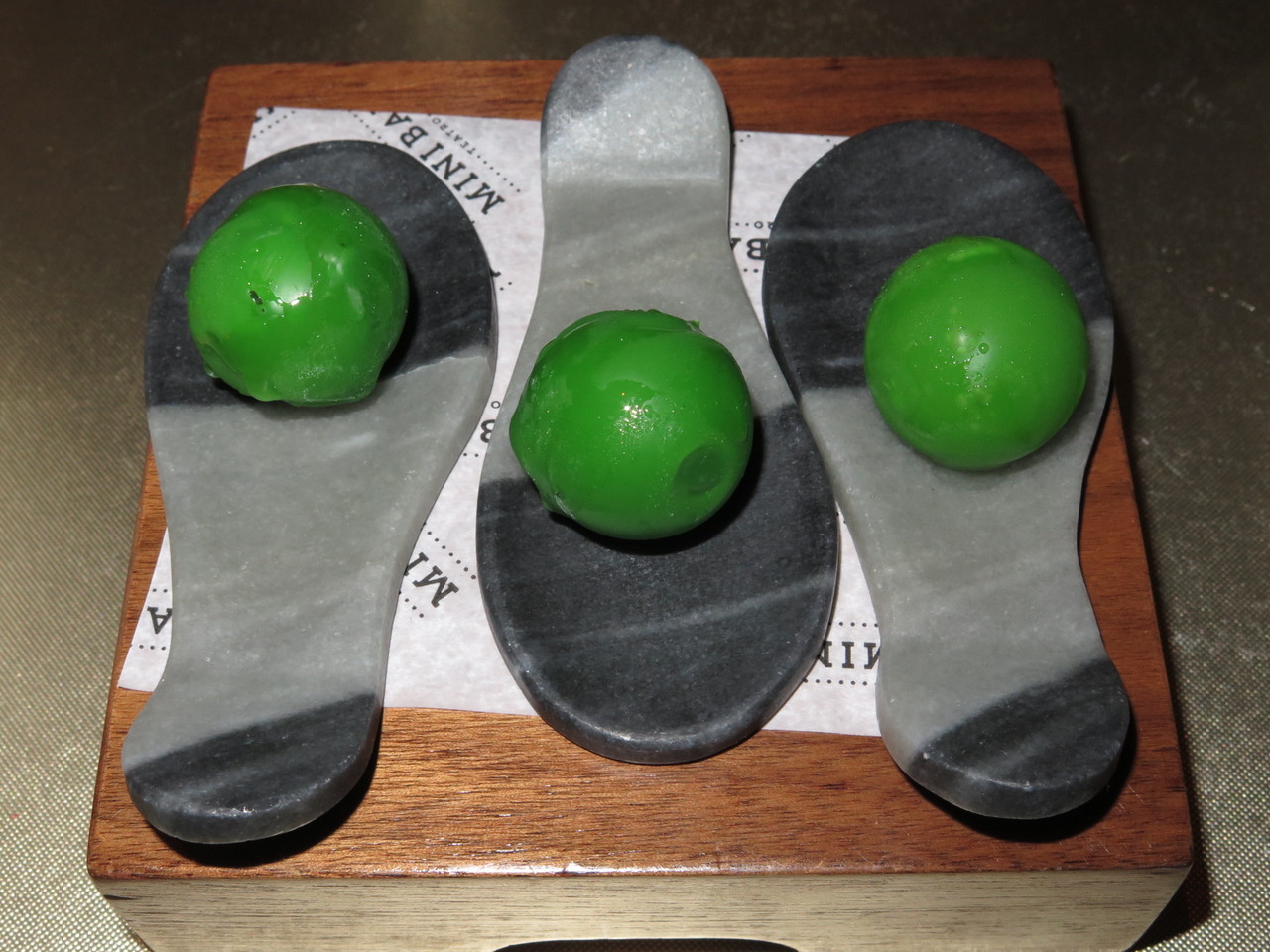 A ementa esta dividida em actos, qual peça, e ainda há os menus degustativos. Como somos preguiçosos, foi mais fácil pedir dois menus. Um Menu em Cartaz, e o Menu Épico para aquela mesa do canto por favor. Não tirei fotos, para ser sincera nem me lembrei, de tal maneira que estávamos entretidos com a degustação. Começou por uma caipirinha em forma de pepita verde. Depois os pratos foram variando, experimentamos frango asado, camarão em ceviche, corneto de novilho, azeitonas explosivas entre outras. Apesar dos nomes serem convencionais, a sua confecção e forma estética em nada eram convencionais. Mas o sabor lá estava! Uns vinham em esfera quase líquida, outros em placa fininha, e tudo acompanhado pela descrição fantástica dos empregados.